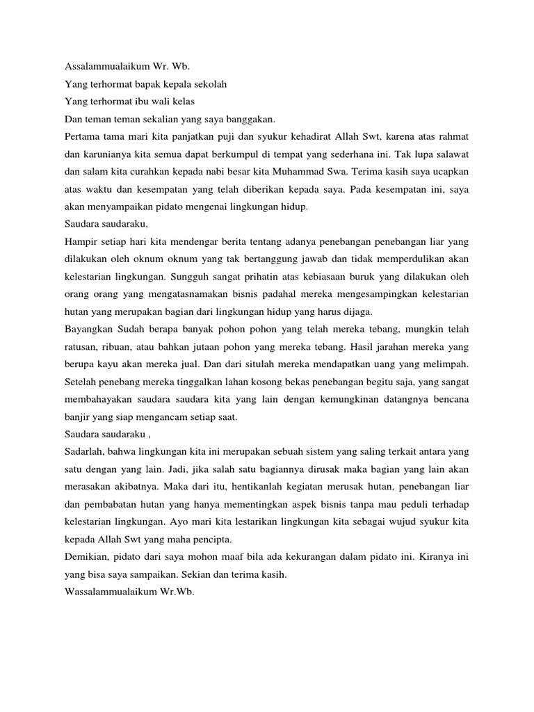 Dimana pidato ini berisaikan pesan moral yang akan dibacakan dalam acara tersebut. Beberapa pidato dengan tema Environment yaitu. Berikut adalah contoh teks pidato yang bertemakan tentang kebersihan lingkungan sekolah. Selain kesadaran pribadi seringkali perlu ditunjang dengan adanya kesadaran masyaraat dengan menggalakkan penyuluhan-penyuluhan kerja bakti ataupun kegiatan sosial untuk menjaga dan melestarikan lingkungan. Yang terhomat Bapak Kepala SMA Negeri 3 Semarang yang saya hormati Bapak Ibu Guru dan seluruh jajaran staff Tata Usaha dan Teman-Teman semua yang saya cintai dan saya banggakan.