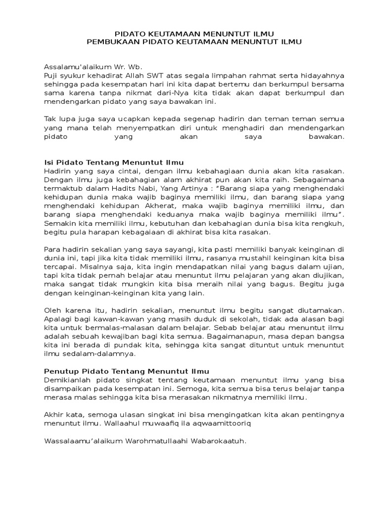 Pidato bahasa arab- Beberapa orang mampu digerakkan dengan kesadaran beberapa yang lainnya digerakkan oleh pidato yang menyentuh hati. Berbicara di depan umum untuk membahas atau menyampaikan suatu hal disebut ceramah. Komunikasi satu arah yang dimaksud adalah dengan hanya diperbolehkannya satu orang yang berbicara yakni orang yang menyampaikan pidato. Pidato singkat wahyu Contoh Naskah Pidato Singkat Dan Jelas Contoh Pidato Pendidikan Singkat Dan Jelas Contoh Pidato Singkat Pendidikan docx Naskah Pidato Singkat Tentang Hari Guru Nasional 8 Contoh Pidato Singkat Perpisahan Pendidikan Bahasa Inggris. Pidato Bahasa Arab Menuntut Ilmu Pada kesempatan kali ini kita akan belajar tentang pidato bahasa Arab yang kali ini tema yang di pilih yaitu tentang Menuntut Ilmu.