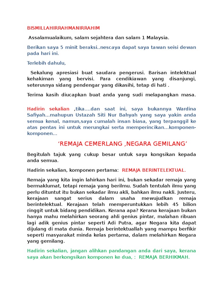 Yang terhormat Dewan juri. Ya alloh ampunilah aku dan kedua orang tuaku. Ayo bersyukur kepada Allah. Teman-temanku maukah kalian masuk surga. Hadirin dan hadirat yang berbahagia.